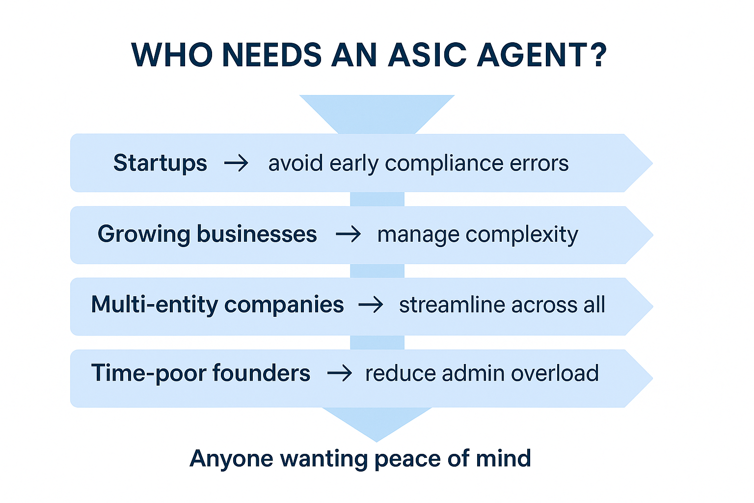 Startups are often laser-focused on product, fundraising, or customer acquisition—but compliance can’t be ignored. An ASIC agent gives startups peace of mind, ensures they don’t miss early compliance steps, and helps avoid costly backtracking later.
